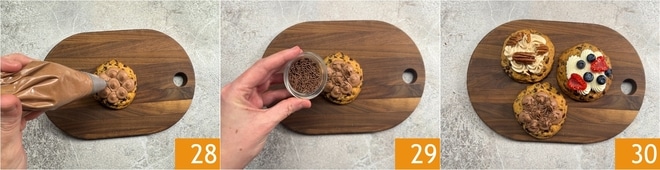 Für den Schokoladengeschmack verwenden Sie das Schokoladen-Frosting 28 und garnieren mit Schokoladenstreuseln 29. Ihre Crumbl Cookies sind bereit, genossen zu werden 30!