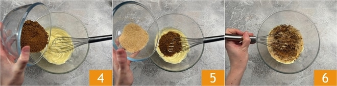 Geben Sie den Vollrohrzucker 4 und den braunen Zucker 5 dazu und mischen Sie erneut mit dem Schneebesen 6.