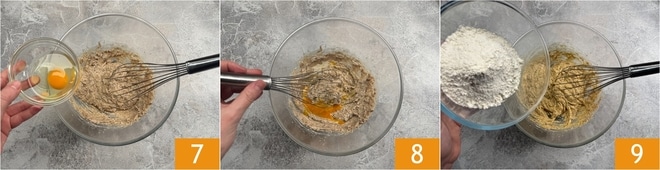 Fügen Sie auch das Ei hinzu 7 und integrieren Sie es mit dem Schneebesen 8, dann fügen Sie das gesiebte Mehl hinzu 9.