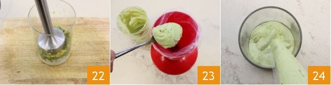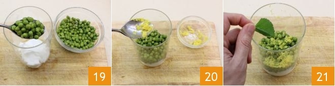 Zum Schluss die Erbsencreme zubereiten: den griechischen Joghurt in einen hohen Behälter geben, die Erbsen hineingeben 19 (wenn Sie es nicht mögen, vorher die Knoblauchzehe entfernen) mit der Zitronenschale 20 und den Minzblättern 21 würzen
