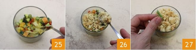 Dann mit einer zweiten Schicht Gemüse bedecken 25 und die Oberfläche mit dem salzigen Crumble abschließen 26. Der Gemüsecrumble ist fertig, dekorieren Sie ihn mit einem Rosmarinzweig 27, stellen Sie ihn bis zum Servieren in den Kühlschrank und genießen Sie ihn bei Raumtemperatur.