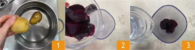 Um die Rote-Bete-Culurgiones mit Kartoffeln und Edelkäse-Sauce zuzubereiten, kochen Sie zuerst die Kartoffeln in kaltem Wasser; es dauert etwa 30-40 Minuten, je nach Größe 1. Bereiten Sie inzwischen den Teig vor: schälen Sie die vorgegarten Rote Beten und geben Sie sie in einen Mixbecher 2 zusammen mit dem Wasser 3.