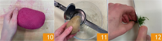 Wenn Sie einen glatten, elastischen und homogenen Teig erhalten haben 10, wickeln Sie ihn in Frischhaltefolie und lassen ihn im Kühlschrank mindestens 30 Minuten ruhen. In der Zwischenzeit sind die Kartoffeln gar, also zerdrücken Sie sie in einer Schüssel 11. Schneiden Sie die Minzblätter in sehr feine Streifen 12.