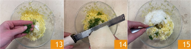 Fügen Sie die Minze zu den zerdrückten Kartoffeln hinzu 13 zusammen mit einer Prise Salz und dem geriebenen Pecorino 14. Gut vermischen, um die Masse zu binden 15 und beiseitestellen.