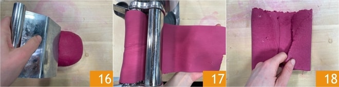 Nehmen Sie den Teig und teilen Sie ihn in zwei Hälften 16, wobei Sie darauf achten, die unbenutzte Portion in Frischhaltefolie einzuwickeln, um ein Austrocknen zu verhindern. Drücken Sie den Teig leicht mit den Händen flach und beginnen Sie, ihn mit der Nudelmaschine auszurollen, beginnend mit der größten Dicke 17. Falten Sie den Teig in die Mitte 18 und rollen Sie ihn mehrmals aus, wobei Sie die Dicke schrittweise verringern.