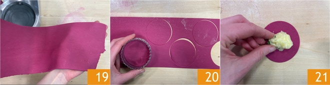 Wenn Sie eine Teigplatte von 2 mm Dicke erhalten haben 19, stechen Sie Kreise mit einem 10 cm Durchmesser Ausstecher aus 20. Sie können die Reste erneut verkneten und nach einer kurzen Ruhezeit wieder ausrollen. Platzieren Sie eine Kugel Füllung in der Mitte jedes Kreises 21.