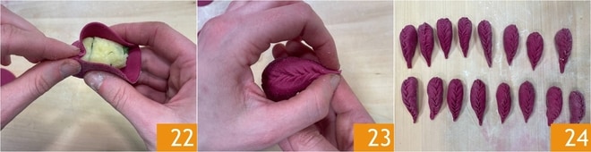 Falten Sie den Kreis in der Mitte und kneifen Sie die Ränder von einem Ende zum anderen zusammen 22, um die Füllung zu versiegeln 23; es ist normal, dass am Ende ein kleines bisschen Füllung herauskommt. Legen Sie die geformten Culurgiones auf eine leicht mit Grießmehl bestreute Arbeitsfläche 24 und stellen Sie sie kurz zur Seite.