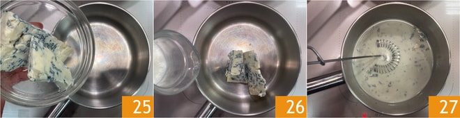 Widmen Sie sich schließlich der Fondue: Geben Sie den Roquefort 25 und die Milch 26 in einen Topf, dann erhitzen Sie alles bei sehr niedriger Hitze unter Rühren mit einem Schneebesen, bis der Käse vollständig geschmolzen ist 27.