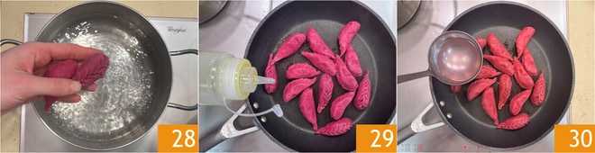 Sie sind bereit für das Kochen: Bringen Sie einen Topf mit gesalzenem Wasser zum Kochen, tauchen Sie vorsichtig die Culurgiones ein 28 und kochen Sie sie 3-4 Minuten. Wenn sie an die Oberfläche kommen, heben Sie sie heraus und geben Sie sie in eine Antihaftpfanne, dann fügen Sie einen Schuss Öl 29 und eine Kelle des Kochwassers hinzu 30. Schwenken Sie alles kurz zum Abschmecken, dann können Sie anrichten.