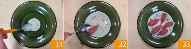Verteilen Sie die Roquefort-Sauce auf dem Boden des Tellers 31, legen Sie die Culurgiones darauf 32 und garnieren Sie mit Minzblättern. Ihre Rote-Bete-Culurgiones mit Kartoffeln und Edelkäse-Sauce 33!