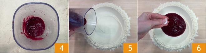 Pürieren Sie alles mit einem Stabmixer zu einem glatten und homogenen Püree 4. Geben Sie das Grießmehl auf das Nudelbrett in Form eines Brunnens, dann gießen Sie das Rote-Bete-Püree in die Mitte 5 und fügen eine Prise Salz hinzu 6.