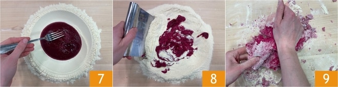Beginnen Sie, das Mehl mit einer Gabel einzuarbeiten 7, dann fahren Sie mit einem Teigschaber fort 8 und schließlich kneten Sie den Teig mit den Händen 9.
