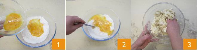 Für die Zubereitung der Burrata-Herzen mit Jakobsmuschelcreme müssen Sie zuerst die frische Pasta herstellen. Befolgen Sie dazu unser Rezept für frische Eierpasta. Sieben Sie das Mehl und geben Sie es auf eine Arbeitsfläche oder in eine große Schüssel und formen Sie eine Mulde in der Mitte, in die Sie die geschlagenen Eier geben 1. Beginnen Sie mit einer Gabel zu mischen 2 und kneten Sie dann mit den Händen 3.