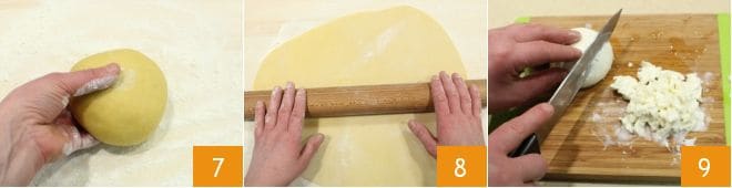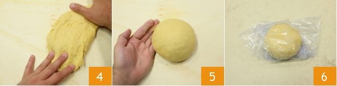 Verlagern Sie den Teig auf eine Arbeitsfläche und kneten Sie ihn mit den Händen von außen nach innen 4, bis das gesamte Mehl eingearbeitet ist und ein glatter und kompakter Teig entsteht 5. Wickeln Sie den fertigen Teig in Frischhaltefolie 6 und lassen Sie ihn etwa eine Stunde lang an einem kühlen und trockenen Ort ruhen.