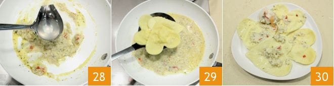 fügen Sie eine Kelle Kochwasser zur Jakobsmuschelsauce hinzu 28, dann geben Sie die Burrata-Herzen in die Pfanne 29 und schwenken Sie sie kurz, um sie mit Geschmack zu versehen. Ihre Burrata-Herzen mit Jakobsmuschelcreme sind bereit zum Servieren 30!