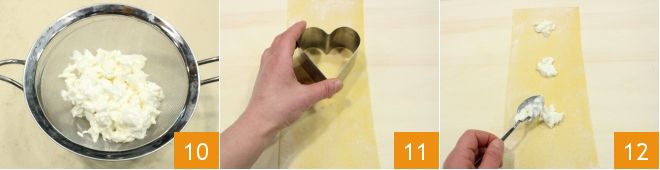 und lassen Sie sie abtropfen, um überschüssige Flüssigkeit zu entfernen 10. Sobald Sie die Teigplatten vorbereitet haben, legen Sie sie auf die Arbeitsfläche. Setzen Sie einen herzförmigen Ausstecher (der Größe 8x8 cm) auf die Teigplatte, ohne sie zu schneiden. Durch leichten Druck hinterlassen Sie Spuren auf dem Teig, die Ihnen später helfen, die Burrata-Füllung in der Mitte der verschiedenen Formen zu platzieren 11. Platzieren Sie einen Löffel Burrata in der Mitte jeder Form 12,