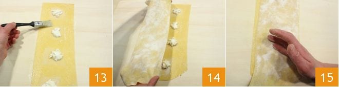 bestreichen Sie den Teig um die Füllung herum mit Wasser oder Eiweiß, damit die Ränder beim Zusammenlegen gut versiegelt bleiben 13. Wenn Sie alle Füllmengen platziert haben, decken Sie sie mit einer gleichgroßen Teigplatte ab 14; bevor Sie die Ränder der Ravioli versiegeln, drücken Sie rund um die Füllung, um die Luft zu entfernen 15.