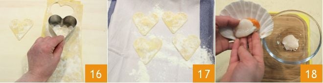 Drücken Sie mit dem Ausstecher auf die Teigplatten und formen Sie die Burrata-Herzen 16, die Sie auf ein sauberes und leicht bemehltes Küchentuch legen 17. Nun bereiten Sie die Jakobsmuschelcreme zu: Nehmen Sie die Jakobsmuscheln aus der Schale 18, entfernen Sie den schwarzen Teil und den Muskel und sammeln Sie das Fleisch und die Koralle in einer Schüssel.