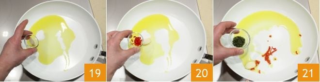 Braten Sie in einer kleinen Pfanne das Öl, den Knoblauch 19 und die gehackte Chilischote 20 sowie den gehackten Thymian 21 an. Wenn der Knoblauch goldbraun ist, geben Sie die Jakobsmuscheln und die Korallen in die Pfanne.