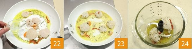 Gießen Sie den Weißwein über die Jakobsmuscheln und lassen Sie ihn verdampfen 22. Wenn die Jakobsmuscheln gar sind 23 (was nur wenige Minuten dauert), geben Sie sie zusammen mit dem Bratensaft in einen Mixer 24.