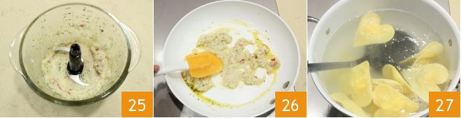 Pürieren Sie die Jakobsmuscheln, bis Sie eine glatte und dicke Creme erhalten 25, die Sie in die Pfanne gießen, in der Sie die Jakobsmuscheln angebraten haben 26. Bringen Sie Wasser in einem Topf zum Kochen, salzen Sie es und kochen Sie die frischen Pasta-Herzen für einige Minuten 27,