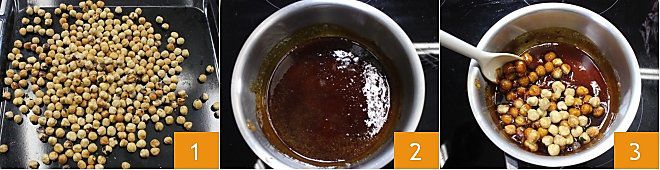 Um die Schokoladen- und Himbeerherzchen zuzubereiten, beginnen Sie mit der Zubereitung des Pralinés: Rösten Sie die Haselnüsse, indem Sie sie auf ein Backblech legen und im vorgeheizten Ofen bei 150° für 35 Minuten backen, bis sie gut gebräunt sind 1. Bereiten Sie währenddessen das Karamell vor (Karamell weitere Informationen): In einem Edelstahltopf mit doppeltem Boden fügen Sie den Kristallzucker löffelweise hinzu und lassen ihn bei niedriger Hitze langsam schmelzen, ohne zu rühren, sondern indem Sie den Topf vorsichtig schwenken. Sie sollten ein braunes Karamell 2 erhalten, dessen Temperatur zwischen 166°- 175° schwanken sollte (verwenden Sie ein Lebensmittelfieberthermometer zur Hilfe). Fügen Sie die Hälfte der gerösteten Haselnüsse dem Karamell hinzu und mischen Sie sehr schnell 3.