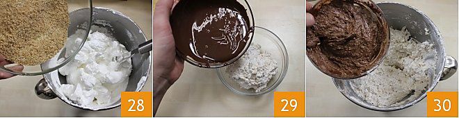 Fügen Sie nach und nach die vermischten Mehle dem geschlagenen Eiweiß hinzu 28 und mischen Sie vorsichtig von unten nach oben mit einem Spatel, um alles gut zu vermengen. Entnehmen Sie einen Teil dieser Mischung und mischen Sie ihn mit der geschmolzenen Schokolade 29, dann fügen Sie alles dem restlichen Teil der weißen Dacquoise hinzu und vermischen 30,