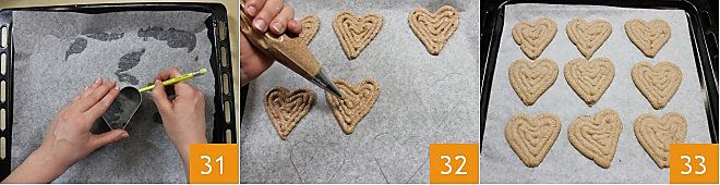 Bereiten Sie ein Backblech vor, das mit Backpapier bedeckt ist, auf dem Sie mit einem Bleistift die Konturen einer Herzform zeichnen (wir haben eine Form mit einer maximalen Länge von 8 cm verwendet), die Sie dann verwenden, um alle anderen Teile zu schneiden, die das Dessert bilden werden 31. Übertragen Sie den Schokoladendacquoise-Teig in einen Spritzbeutel mit glatter Tülle und beginnen Sie vom Rand aus, konzentrische Herzen mit dem Teig zu zeichnen (die Menge reicht für 4 Dacquoise-Herzen, aber es könnten, abhängig von der Tüllengröße, mehr sein. In diesem Fall servieren Sie sie einfach als Baiserherzen) 32. Backen Sie die Herzchen im vorgeheizten Umluftofen bei 180° für etwa 10 Minuten (oder statisch bei 200° für 10-15 Minuten) 33.