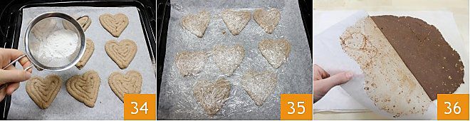 Sobald sie aus dem Ofen kommen, streuen Sie die Dacquoise-Herzen mit reichlich Puderzucker 34 und decken Sie sie sofort mit Frischhaltefolie ab, um zu verhindern, dass sie austrocknen 35. In der Zwischenzeit sollte das Praliné fertig sein und lässt sich leicht von dem oberen Backpapierblatt lösen 36.