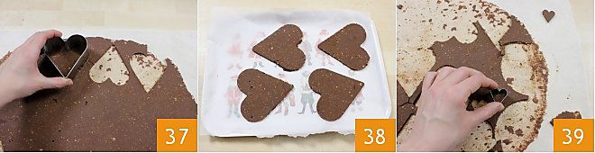 Verwenden Sie die zuvor verwendete Herzform, um aus dem Praliné 8 Herzen auszuschneiden, die die Basis unseres Desserts bilden (37-38). Wenn Sie eine kleinere Herzform haben, schneiden Sie aus den Praliné-Resten kleine Herzchen aus, die Sie dann zur endgültigen Dekoration des Desserts verwenden 39. Legen Sie alle Herzen auf ein mit Backpapier bedecktes Tablett in den Kühlschrank und lassen Sie sie für mindestens 20-30 Minuten abkühlen.