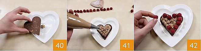Übertragen Sie die Schokoladenbuttercreme in einen Spritzbeutel mit einer schmalen Sterntülle und waschen Sie die Himbeeren gut, dann können wir mit dem Zusammenbau der Schokoladen- und Himbeerherzchen fortfahren. Setzen Sie einen Tupfer Creme auf den Boden eines Desserttellers, um das erste Praliné-Herz zu fixieren, das die Basis des Desserts bildet 40. Füllen Sie die Basis mit Cremetupfen, bis die gesamte Oberfläche bedeckt ist 41 und legen Sie entlang der Kanten eine Reihe von Himbeeren 42.