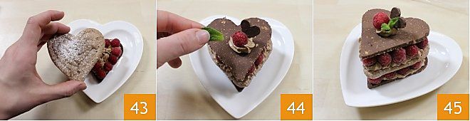 Fahren Sie mit dem Dacquoise-Herz fort 43, füllen Sie auch dieses mit Cremetupfen und dekorieren Sie auch diese Schicht mit Himbeeren. Beenden Sie mit einem Praliné-Herz und dekorieren Sie mit einem Cremetupfen in der Mitte, einer Himbeere, einem kleinen Praliné-Herzchen und einem frischen Minzblatt 44. Verfahren Sie auf diese Weise, um 3 weitere Desserts zu erstellen, und hier sind Ihre Schokoladen- und Himbeerherzchen fertig 45! Sind sie nicht wunderschön? Bewahren Sie sie bis zu einer halben Stunde vor dem Servieren im Kühlschrank auf!