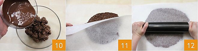 Schmelzen Sie die Schokolade und fügen Sie sie den anderen Zutaten hinzu 10, um alles gut zu vermischen. Gießen Sie das Praliné zwischen 2 Backpapierblätter 11 und rollen Sie es mit einem Nudelholz gut aus, bis es eine Dicke von einem halben cm erreicht 12. Das Praliné muss bei Raumtemperatur fest werden, bis es sich leicht von den beiden Backpapierblättern lösen lässt (dies dauert etwa 2 Stunden).