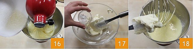 Fügen Sie den Zuckersirup nach und nach hinzu 16 und fahren Sie mit dem Schlagen fort, bis die Mischung vollständig abgekühlt ist. Während die geschlagenen Eigelbe abkühlen, arbeiten Sie die Butter bei Raumtemperatur mit der Vanilline, um sie zu einer Creme zu machen, und helfen Sie sich dabei mit einem Spatel 17. Fügen Sie dann die Butter zu den geschlagenen Eigelben hinzu 18 und