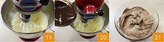 schlagen weiter, um eine gut schaumige und cremige Mischung zu erhalten 19. Schmelzen Sie die dunkle Schokolade, über einem Wasserbad oder in der Mikrowelle, lassen Sie sie abkühlen, indem Sie sie ständig mit einem Spatel umrühren, und fügen Sie sie der Buttercreme hinzu 20. Arbeiten Sie die Mischung weiter, bis die Schokolade vollständig mit den anderen Zutaten vermischt ist. Übertragen Sie die erhaltene Creme in eine Schüssel 21 und lassen Sie sie bis zur Verwendung im Kühlschrank abkühlen.