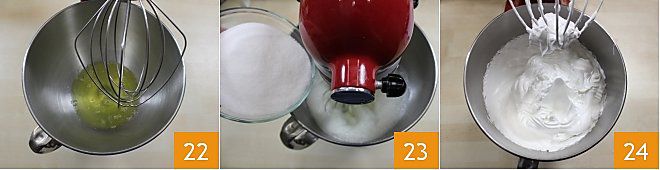 Fahren Sie mit der Zubereitung der Schokoladendacquoise fort: Schlagen Sie das Eiweiß mit der Küchenmaschine oder einem elektrischen Mixer 22 und wenn sich ein Schaum bildet, fügen Sie den Zucker hinzu 23 und schlagen weiter, bis es die Konsistenz einer festen und dichten Baiser erreicht hat 24.
