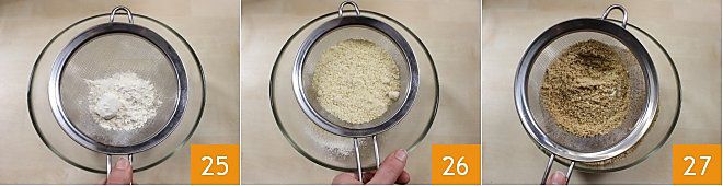 Sieben Sie in einer Schüssel das Mehl 25, das Mandelmehl 26 und das Haselnussmehl 27. Schmelzen Sie die dunkle Schokolade, über einem Wasserbad oder in der Mikrowelle, und lassen Sie sie abkühlen (sie sollte 40° erreichen).