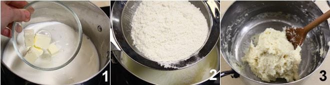 Um den Teig für die Herzchen zuzubereiten, gießen Sie die Milch in einen Topf, fügen Sie die Butter und das Salz hinzu 1 und bringen Sie es fast zum Kochen; nehmen Sie den Topf vom Herd und fügen Sie sofort das Mehl auf einmal hinzu 2. Mit einem Holzlöffel kräftig rühren, bis die Zutaten 3 vermischt sind und Sie eine ziemlich kompakte Masse erhalten (wenn sie klumpig aussieht, machen Sie sich keine Sorgen).