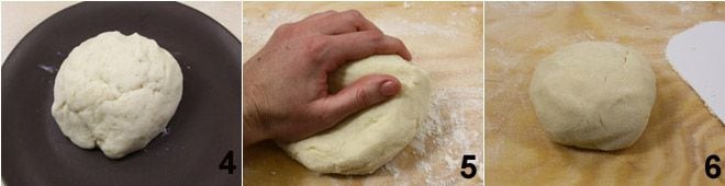 Lassen Sie den erhaltenen Teig abkühlen 4, dann geben Sie ihn auf eine leicht bemehlte Arbeitsfläche und kneten Sie ihn mit den Händen 5, bis Sie einen glatten und homogenen Teig erhalten 6.