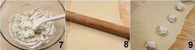 Rollen Sie den Teig der Herzchen mit einem Nudelholz 8 aus, bis er ein rechteckiges Blatt von etwa 1-2 mm Dicke bildet: Nehmen Sie mit einem Teelöffel etwas von der Füllung und legen Sie es in kleinen Häufchen auf das Teigblatt 9, im Abstand von etwa 10 cm voneinander entfernt.
