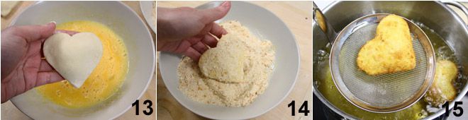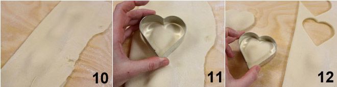 Bedecken Sie die Häufchen mit dem Teig (indem Sie es wie ein Buch schließen) 10 und schneiden Sie die Formen mit dem herzförmigen Ausstecher aus (11-12). Verfahren Sie auf diese Weise, indem Sie die Reste jedes Mal neu kneten, bis die Zutaten aufgebraucht sind. Sobald Sie alle Formen erhalten haben, nehmen Sie zwei Teller: Auf einen legen Sie die Semmelbrösel und auf den anderen das geschlagene Ei.