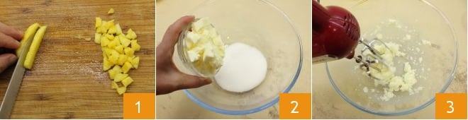 Um die Cupcakes Piña Colada zuzubereiten, schälen Sie die frische Ananas und schneiden Sie 170 g in kleine Würfel 1, geben Sie die weiche Butter und den Zucker in eine Schüssel 2, schlagen Sie sie mit einem elektrischen Mixer, um eine Creme zu erhalten 3