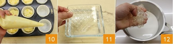 Verteilen Sie den Teig in die 12 Förmchen 10, füllen Sie sie zur Hälfte, damit sie beim Backen den Rand der Förmchen erreichen. Backen Sie im vorgeheizten statischen Ofen bei 180° für 20 Minuten (oder Umluft 160° für 10-15 Minuten). In der Zwischenzeit kümmern Sie sich um die Creme: Geben Sie die Gelatineblätter für 10 Minuten in eine kleine Schüssel mit kaltem Wasser, um sie weich zu machen 11, gießen Sie die Kokosmilch in einen Topf und erhitzen Sie sie bei mittlerer Hitze, schalten Sie dann die Hitze aus und fügen Sie die abgetropfte und gut ausgepresste Gelatine hinzu 12,