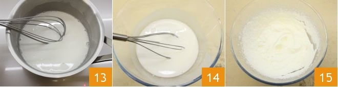 verrühren Sie mit dem Schneebesen, um die Gelatine zu schmelzen 13. Übertragen Sie die Kokosmilch in eine Schüssel 14, decken Sie sie mit Frischhaltefolie direkt auf der Oberfläche ab und lassen Sie die Creme für 1 Stunde im Kühlschrank fest werden. Nach dieser Zeit schlagen Sie die flüssige frische Sahne mit dem Puderzucker auf 15