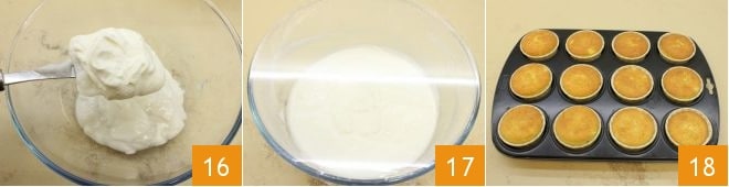 und fügen Sie sie der Kokosmilch hinzu 16, mischen Sie mit einem Spatel, um die Mischung zu integrieren, bedecken Sie die Creme mit Frischhaltefolie 17 und lassen Sie sie erneut für 30 Minuten im Kühlschrank fest werden. Nach der Ruhezeit nehmen Sie die inzwischen abgekühlten Cupcakes 18, entfernen Sie sie aus der Muffinform und lassen Sie die Papierförmchen dran.