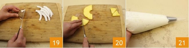 Machen Sie die Dekorationen: Schneiden Sie die Kokosnuss in Spalten 19 und die Ananasscheiben in kleine Dreiecke 20. Übertragen Sie die Kokoscreme in einen Spritzbeutel mit Sterntülle 21