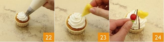 und drücken Sie einen Tupfer auf jeden Cupcake 22, garnieren Sie mit den Ananasstücken 23, einer aus der Konservierungsflüssigkeit abgetropften Kirsche, den Kokosscheiben (oder dem getrockneten Kokosnuss) und den Minzblättern 24. Ihre Cupcakes Piña Colada sind fertig!