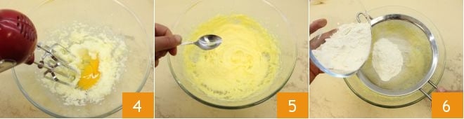 Fügen Sie dann die Eier hinzu 4 und wenn sie gut in den Teig eingearbeitet sind, geben Sie das Rumaroma hinzu 5, mischen Sie mit einem Spatel und fügen Sie auch das gesiebte Mehl 6 und das Backpulver hinzu.