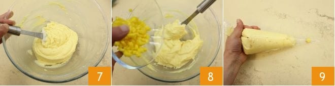 Rühren Sie, bis die trockenen Zutaten gut vermischt sind 7, und fügen Sie schließlich die frischen Ananaswürfel hinzu 8. Übertragen Sie den Teig in einen Spritzbeutel ohne Tülle 9, und setzen Sie Papierförmchen in ein 12er-Cupcake-Blech.