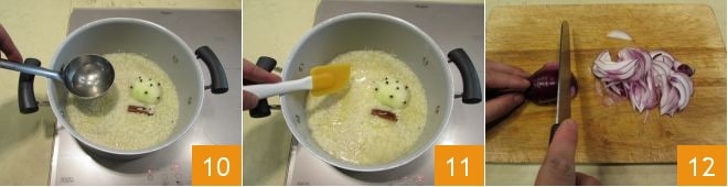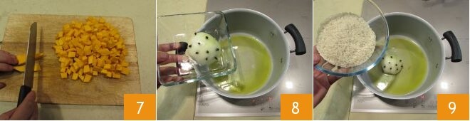 Schneiden Sie ihn in Würfel von gleicher Größe wie die Kichererbsen: das erleichtert später eine gleiche Garzeit wie die der Kichererbsen. Behalten Sie die Kürbiswürfel beiseite 7. Nehmen Sie einen Topf und braten Sie in einem Faden Öl die geschälte halbe Zwiebel an, in die Sie die Gewürznelken gesteckt haben 8. Diese Technik dient dazu, die Nelkenblüten nicht im Topf zu verteilen (die dem Gericht Geschmack verleihen), da sie am Ende der Garzeit entfernt werden sollen. Fügen Sie dann den Reis hinzu 9 und rösten Sie ihn einige Minuten, unter Rühren.